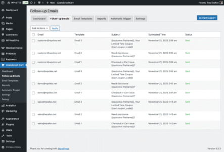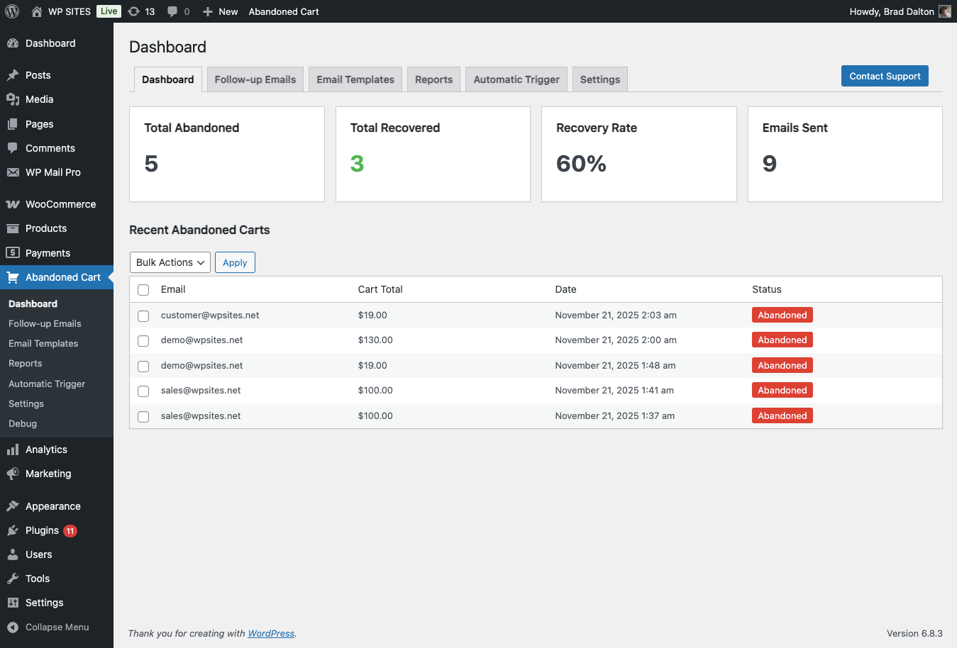 - Dashboard: Overview of abandoned carts, recovered sales, recovery rate, and email statistics