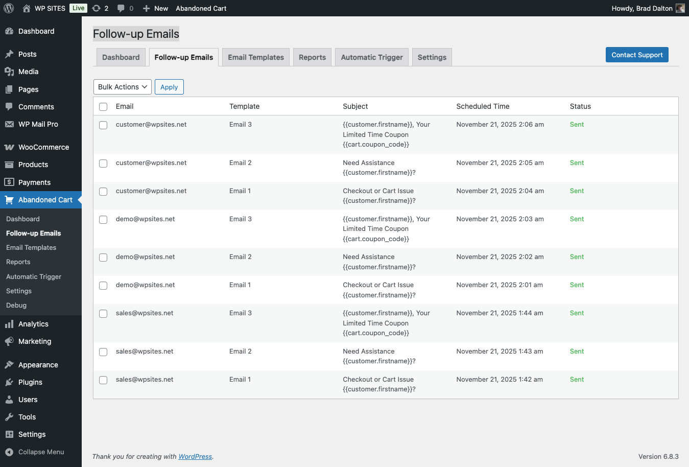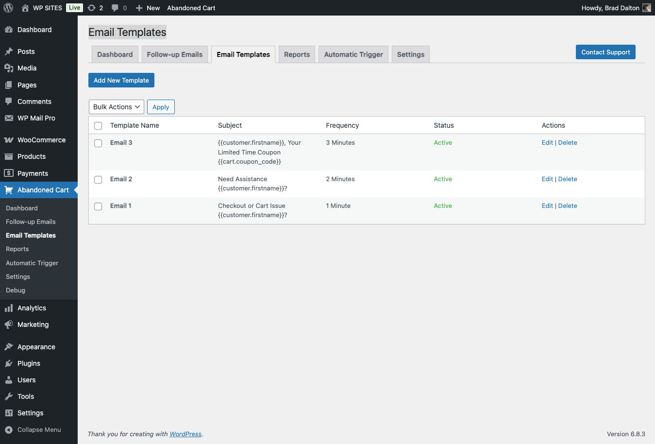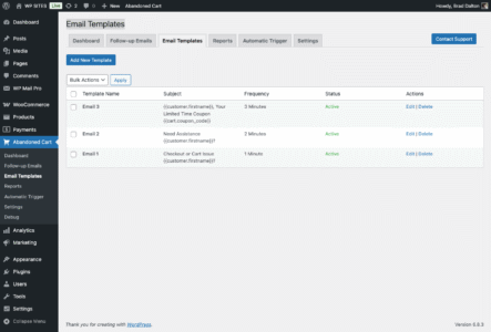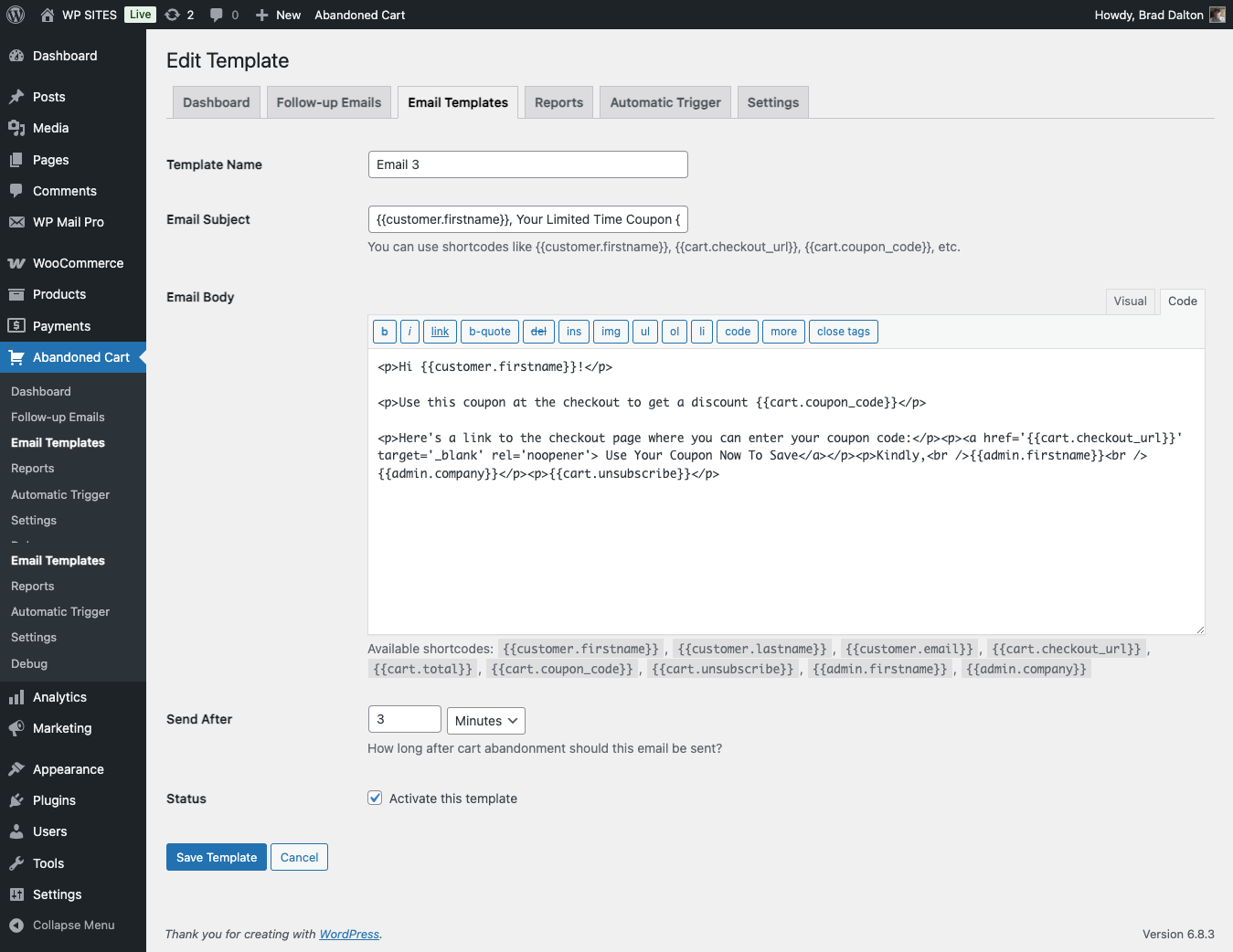 Yes. You can create unlimited email templates with your own copy, add coupon codes using shortcodes, and configure when each email is sent (minutes, hours, or days after abandonment).
