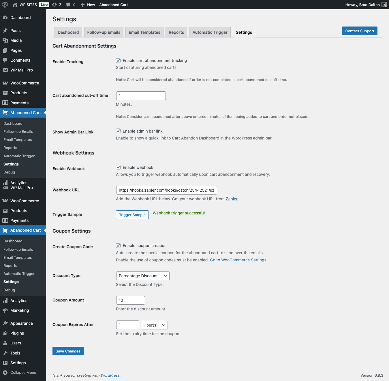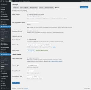 Yes! Enable webhooks in Settings and add your webhook URL. The plugin will automatically trigger webhooks when carts are abandoned or recovered.