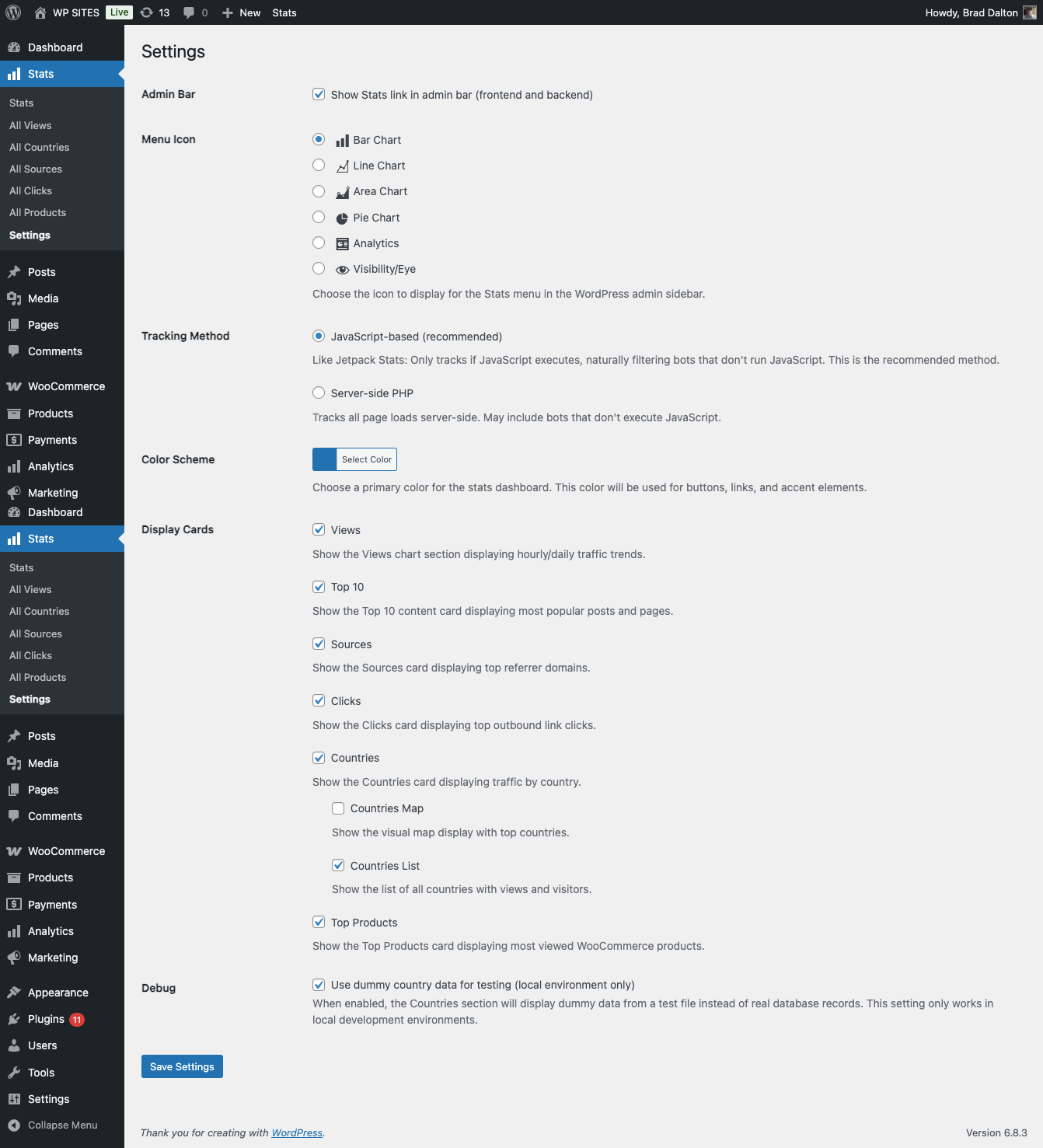 - Settings Page: Configure admin bar visibility, menu icon, tracking method, color scheme, card visibility, and other plugin settings