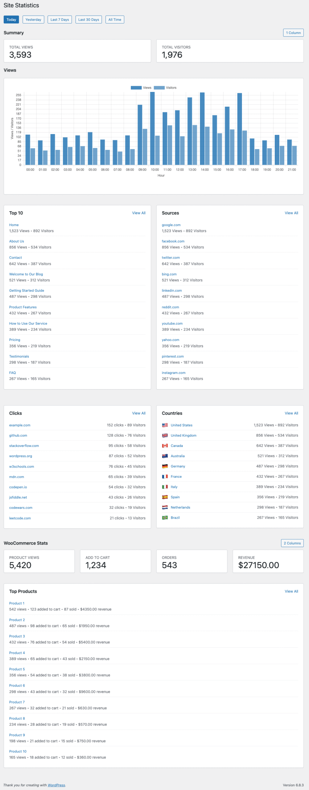 - Date Range Filters: View stats for today, yesterday, last 7 days, last 30 days, or all time