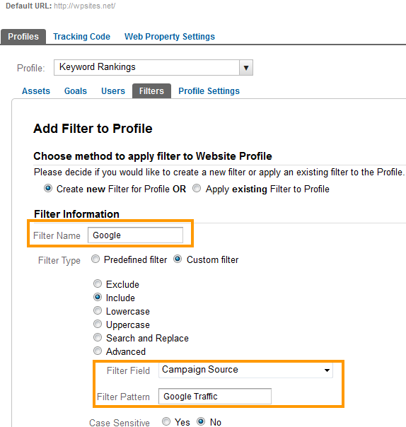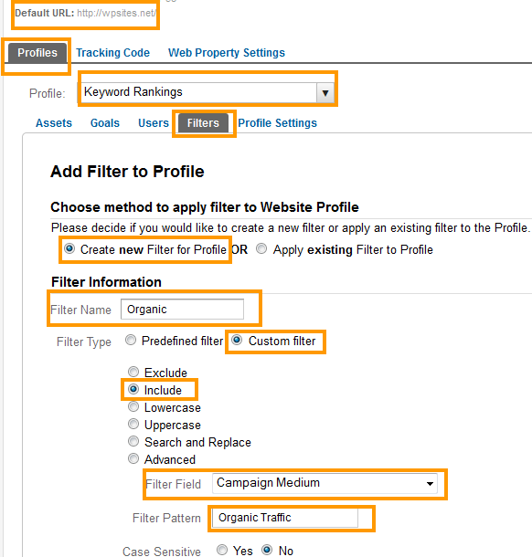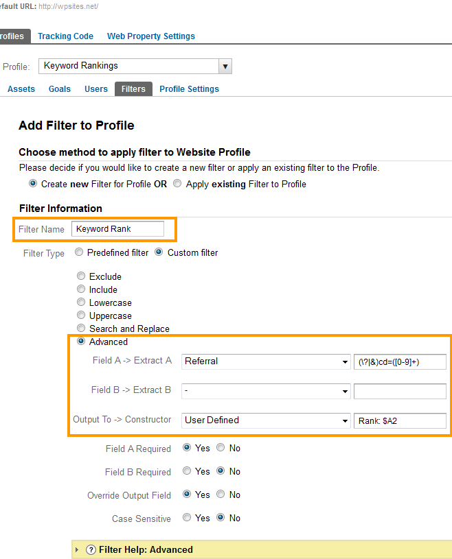Even though you probably already have a Google analytics profile setup for the domain you wish to track keyword rankings, you still need to create another one for the custom filters you are about to setup as well, under the Default URL for the domain you should already be tracking.