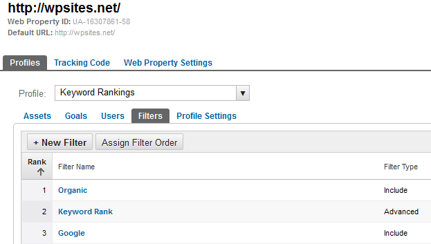 You won’t need to add the analytics code again, simply name your new profile something like “Keyword Rankings” and add the 3 new custom filters to the new profile, NOT your existing profile for the same domain.