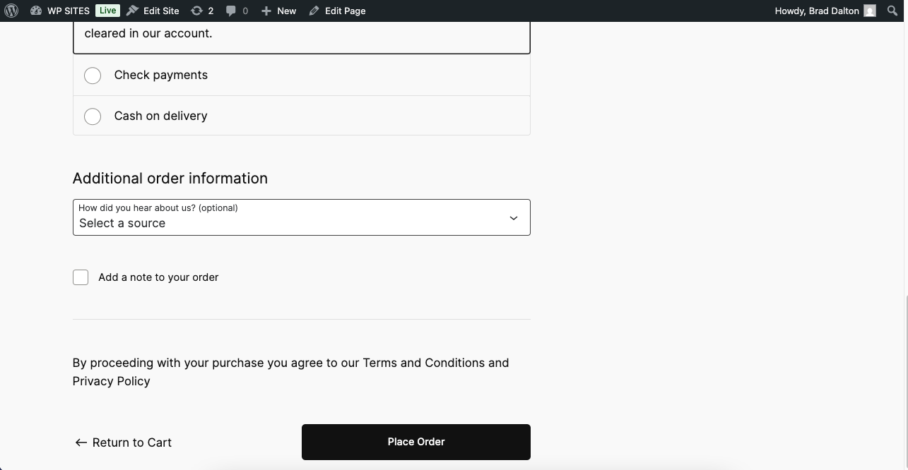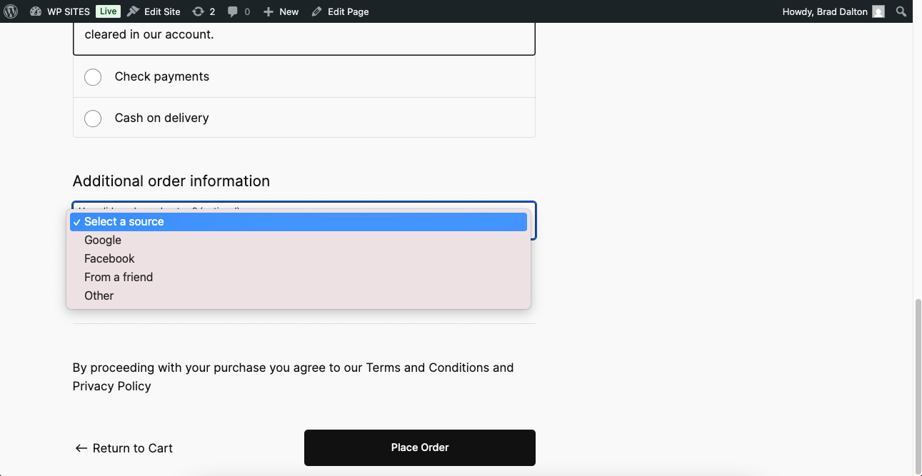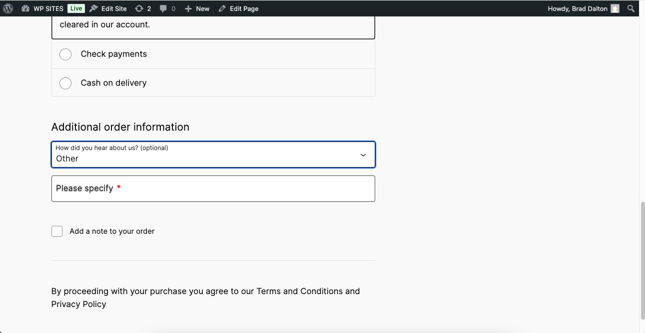 Shows the conditional select and text fields added to the order information block when using the block checkout for WooCommerce.