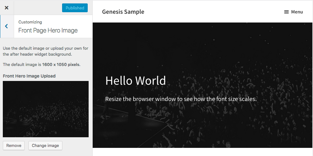 - The image can be added/changed using the Customize > Front Page Hero Image settings.