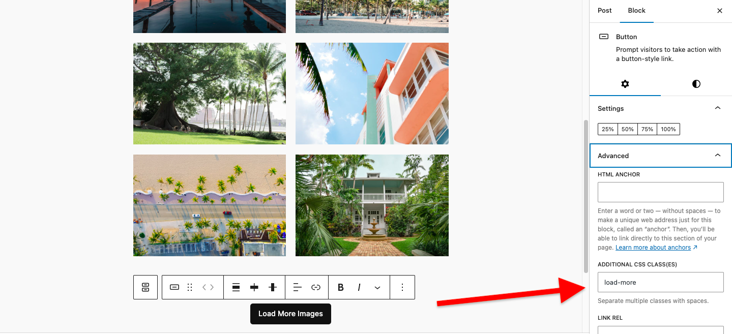- Using the block editor, Insert a button after your gallery and add the class load-more to the Advanced > Additional CSS Classes field as seen in the following screenshot :