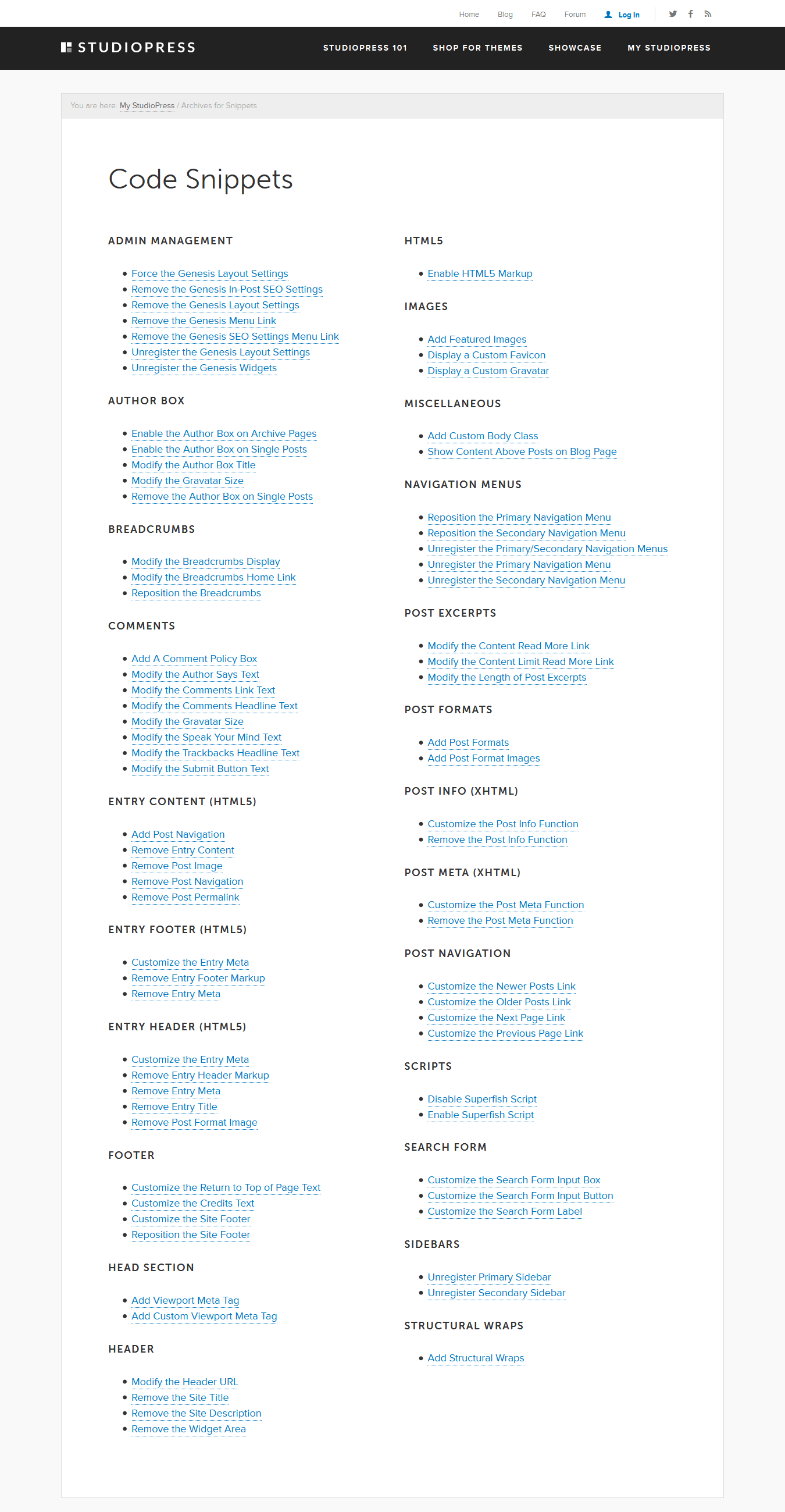 Here’s a list of all the current code snippets StudioPress give you which work on any Genesis child theme like StudioPress.
