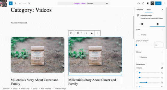 In this example, we’ll create a 2 column posts template you can use in any block theme for use with all terms associated to your taxonomy or specific terms. In this example, we’ll create a custom template for the category taxonomy for the videos term.