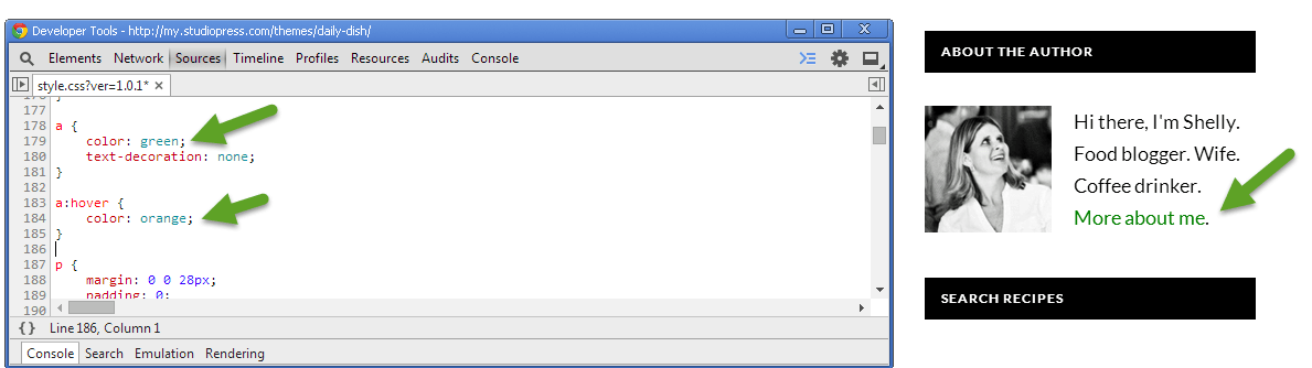 The window also tells us the line in the themes style.css file where we can find the code to modify which in this example starts on Line 178.