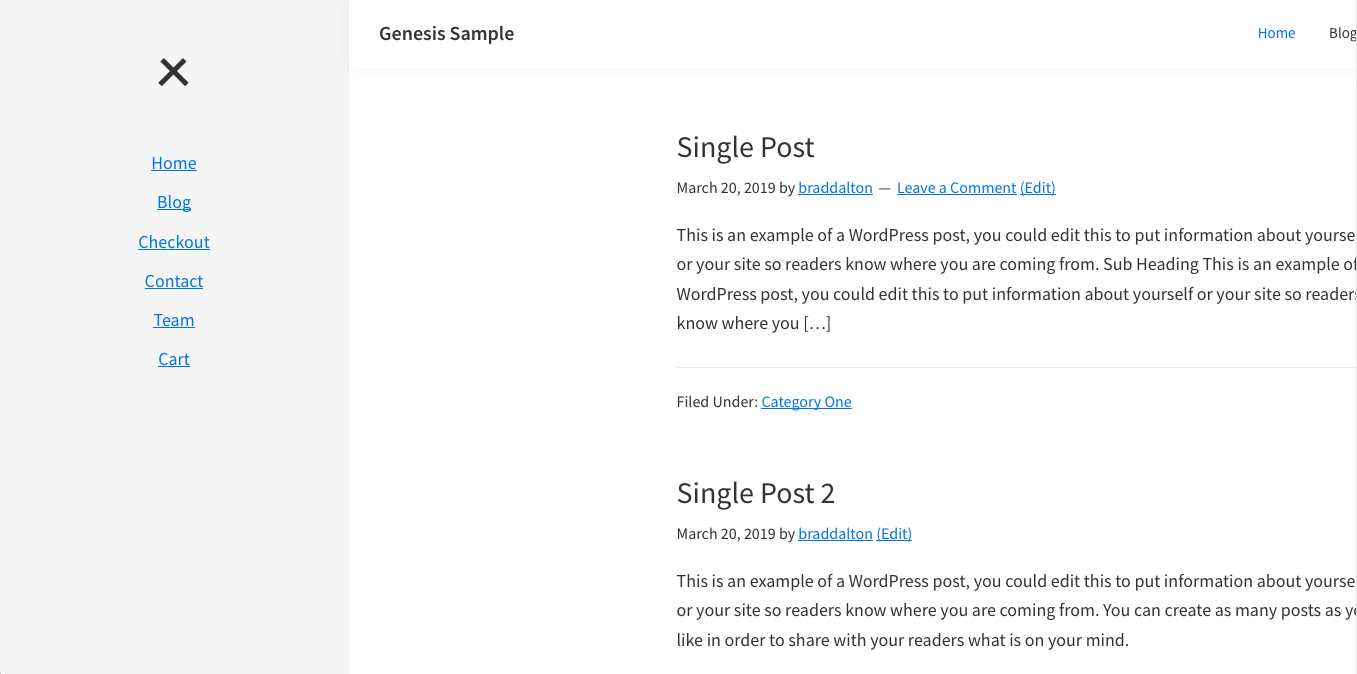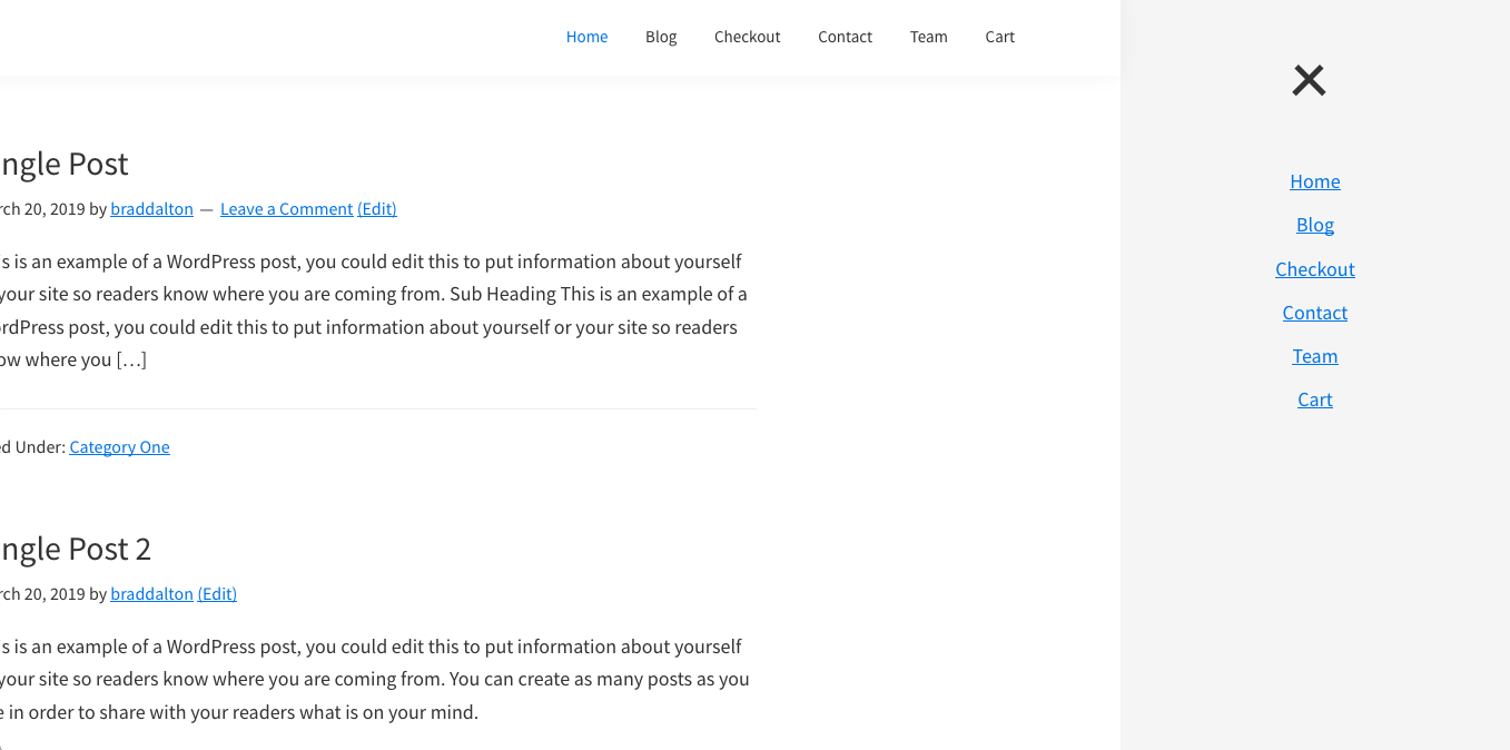 Shows the contents of the Side Menu widget area displaying in a full height section you can toggle open and close using the icon on the site header. Works on both the left or right side of your site container simply by selecting the radio buttons on the customizer.