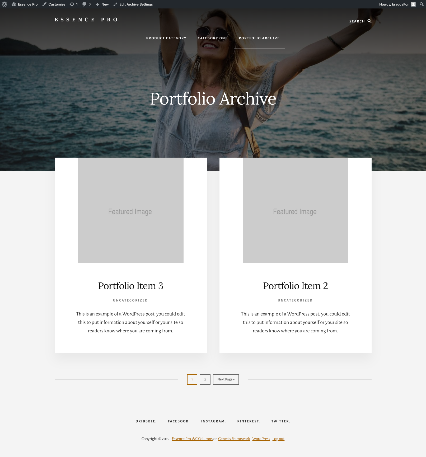 Shows the custom post type archive page added to Essence Pro displaying the same as the default category archive page.