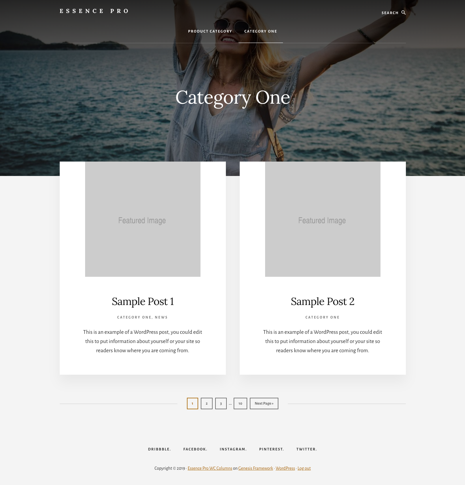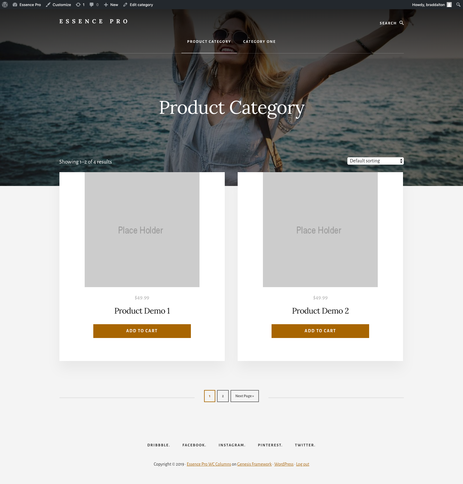In this example, the product category displays products in 2 columns and is styled like the default post category archive in Essence Pro.