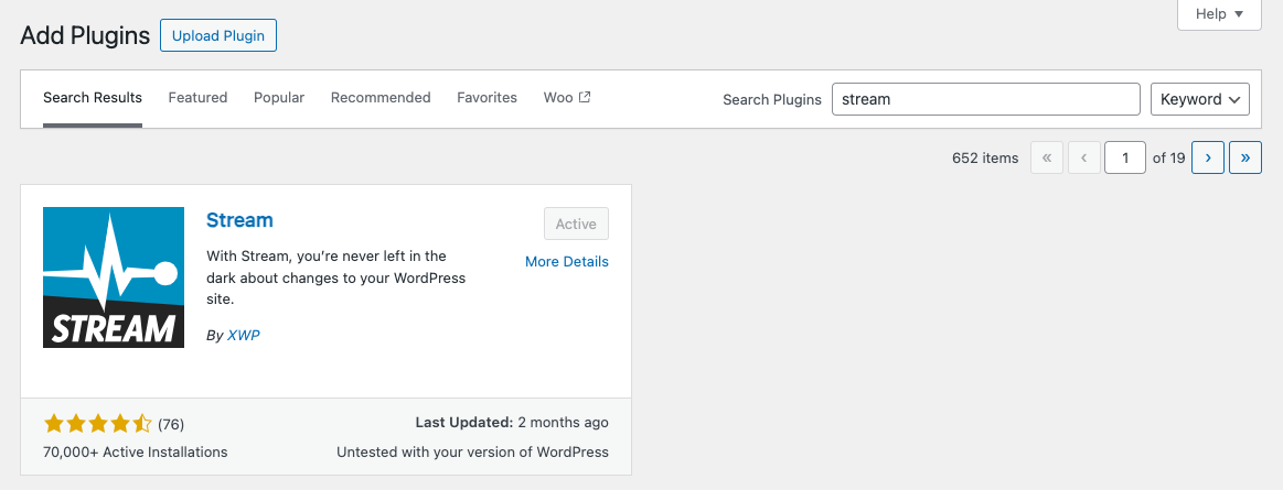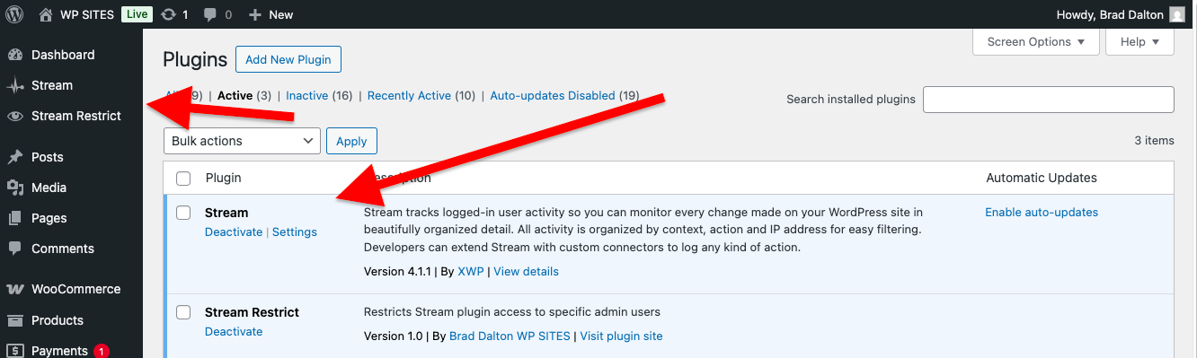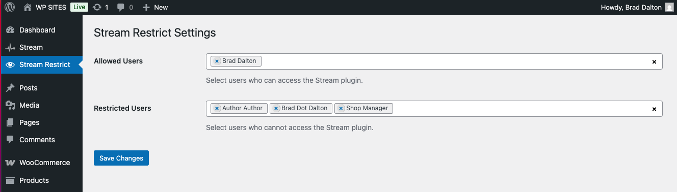 Thats where Stream Restrict comes in handy. Stream Restrict enables you to select which users, in this case, which admins can see the Stream plugin on the plugins page as well as the Stream menu item at the top of your WordPress dashboard.