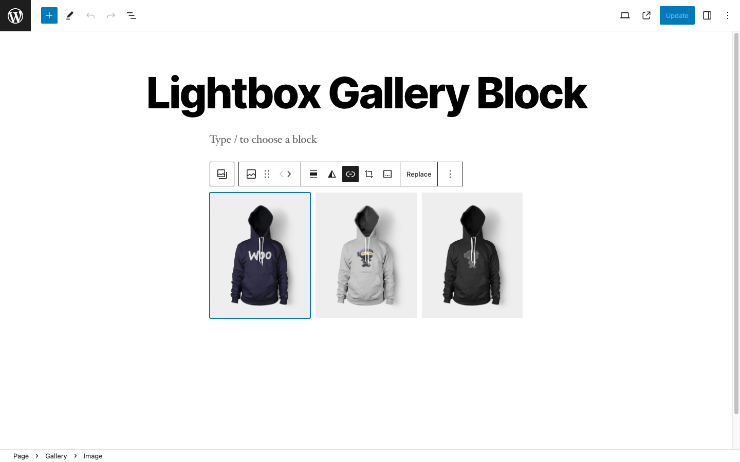 Shows the gallery block added to a page and gallery images displaying in a lightbox once the Lightbox Gallery Block plugin is activated.