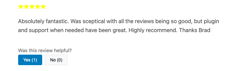 Helpful votes let your readers click “Yes” or “No” to rate how helpful a review is. This helps other visitors know which reviews are most valuable and builds trust on your website.