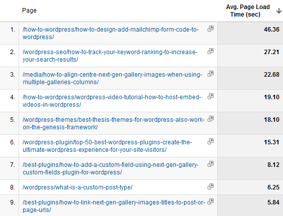 The Explorer report provides a list of your slow loading pages including the Average Page Load Time and URL of the page which makes it very easy to find and fix.