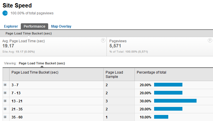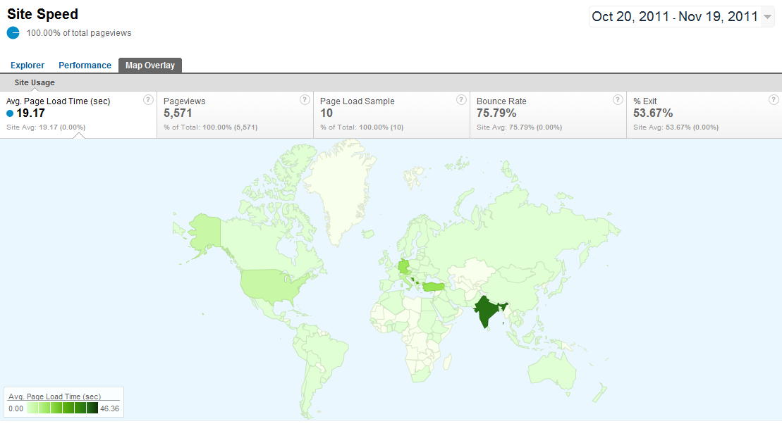 The Map Overplay report displays the site speed which your visitors experience by Geographic location. This would also explain why the Performance report looks so bad.