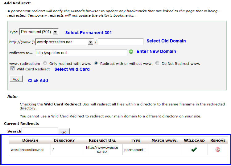 I used one of these examples to effectively redirect all URL’s from my old domain to my new domain’s exact URL’s.