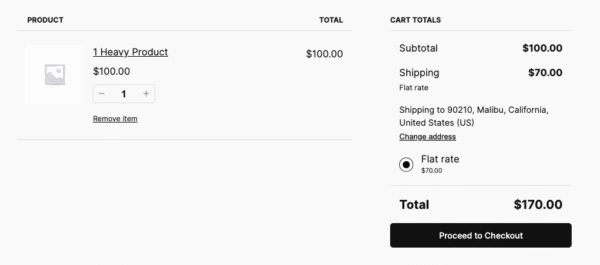 Add flat rate fee using shipping class. This code will add an extra $50 to the shipping cost if any item in the cart is assigned the “heavy” shipping class.