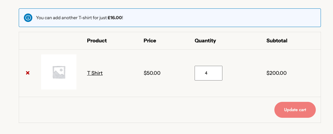 This code displays a message on the cart page to entice customers to buy more products if their cart quantity is below a set threshold. You can tweak the code to work with any product category, price and discount percentage.