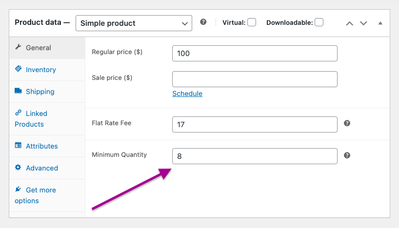 The code in this download folder enables you to set a minimum quantity per product using WooCommerce. The code adds :