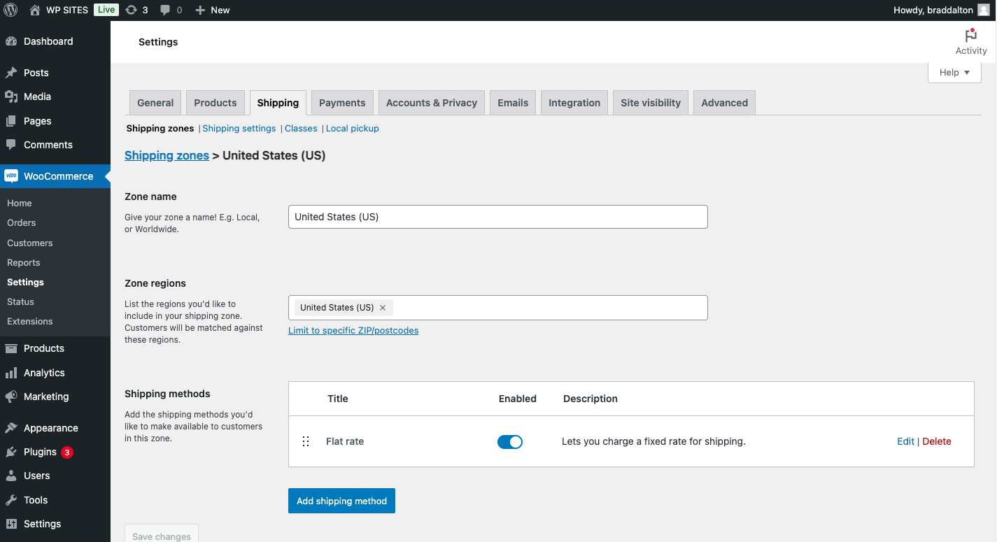 - All you need to do is set the flat rate shipping method for your shipping zone. In your WordPress Dashboard, Go to WooCommerce > Settings > Shipping, add or edit an existing zone and add a flat rate shipping method. If you set the cost to 0, any zip code not included in your code will be set to free shipping. If you add a cost, any postal code not set in the code will default to this cost.