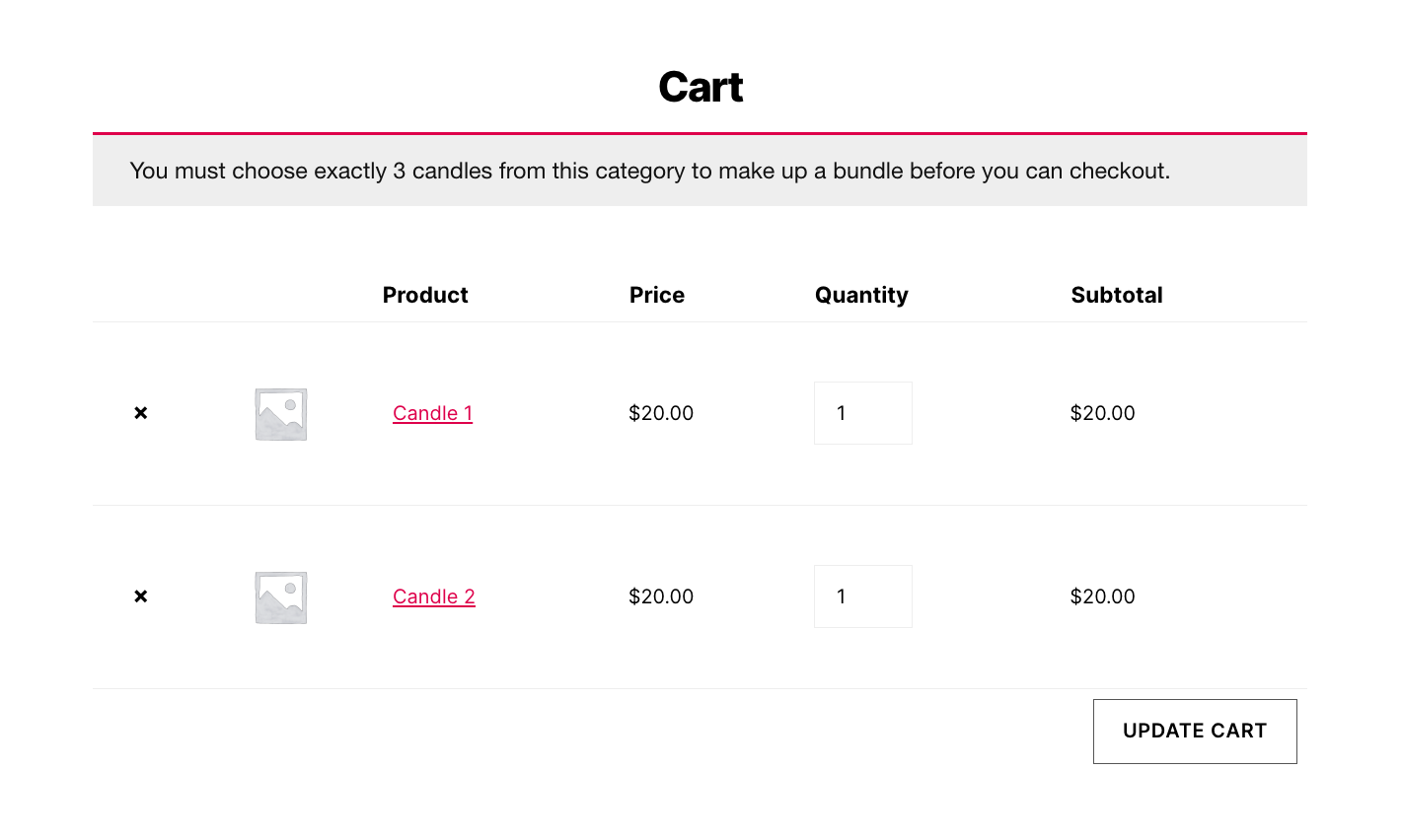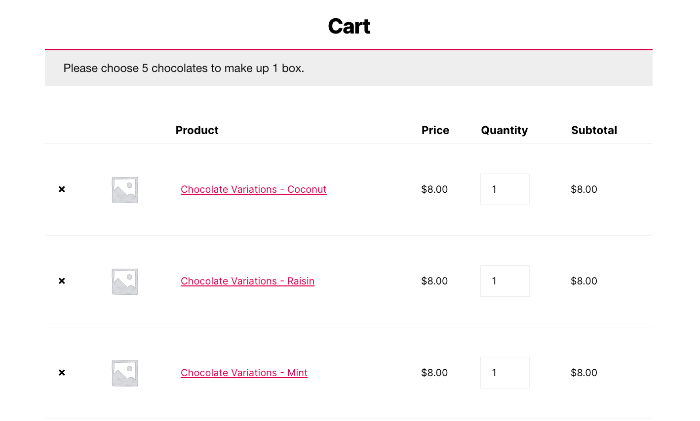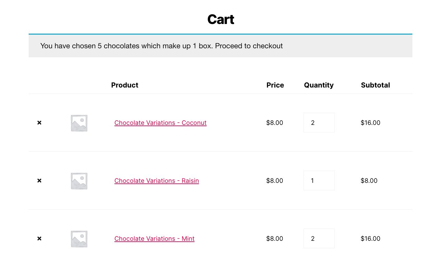 In this case, your customer can only proceed to the checkout once 5 chocolate variations to make up 1 box have been added to the cart.