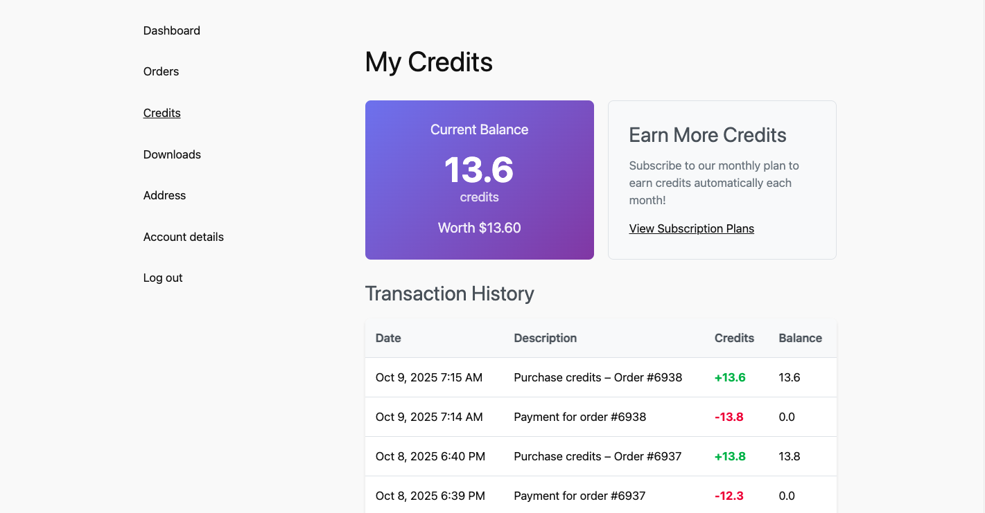 Admins and shop managers can access customer transactions for credits using the Transactions page and customers can access their credit usage on thier my account > credits page while logged in.
