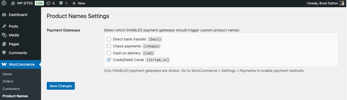 Example: Check “BACS” if you want custom names when bank transfer is selected - Click “Save Changes”