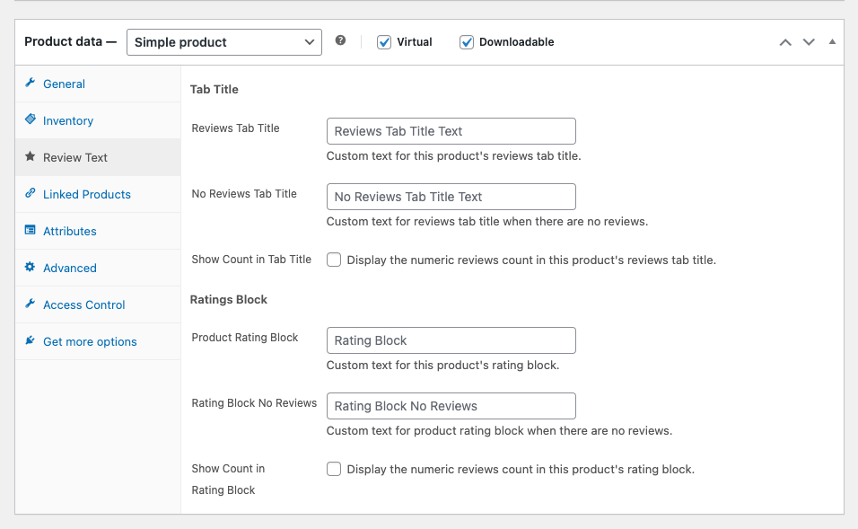 - Rating Block No Reviews: Text shown when a product has no reviews (leave empty to use WooCommerce default)