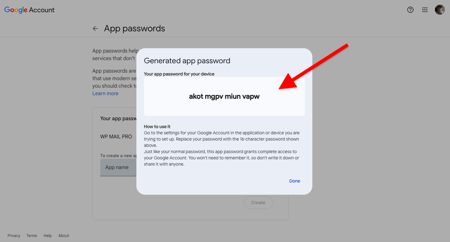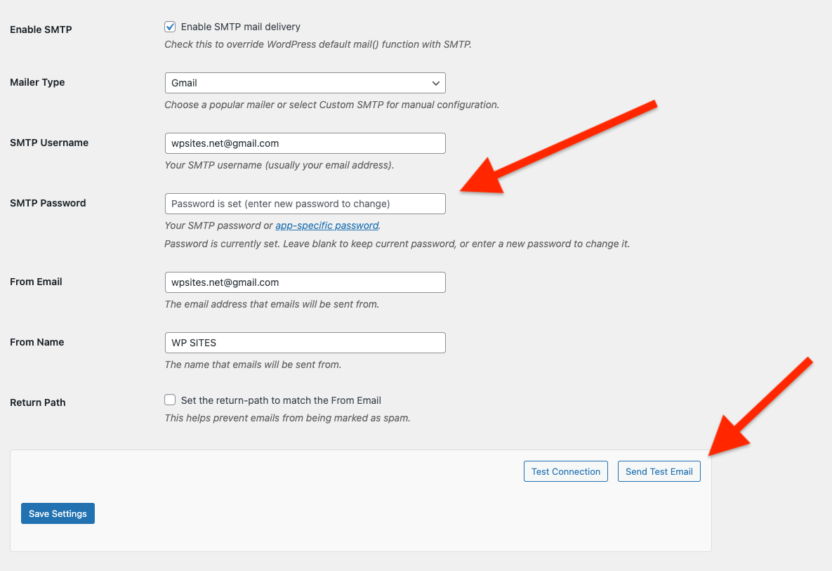 You can now copy and paste your app password into the WP MAIL PRO > SMTP Password field and click the Send Test Email button.