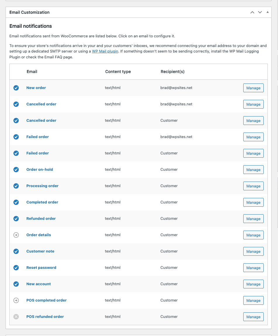 - Click “Manage” next to any email type (like “New Order” or “Customer Processing Order”)