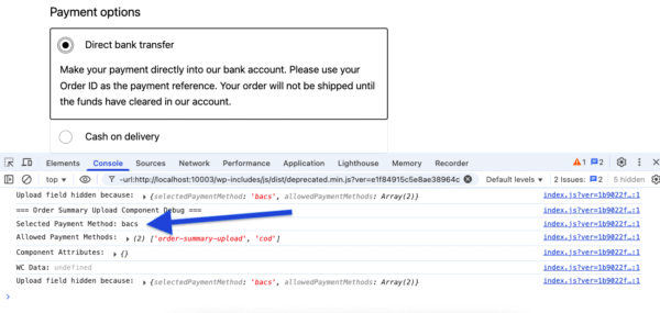 In the following example we toggle between COD and BACS to test our code is working with the WooCommerce checkout blocks payment options.