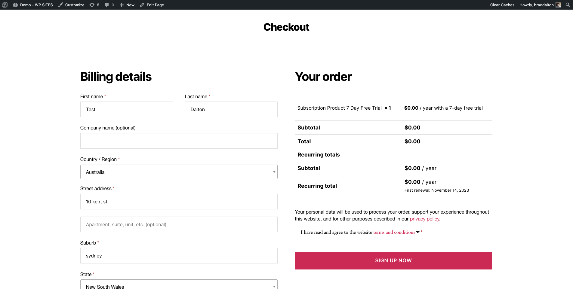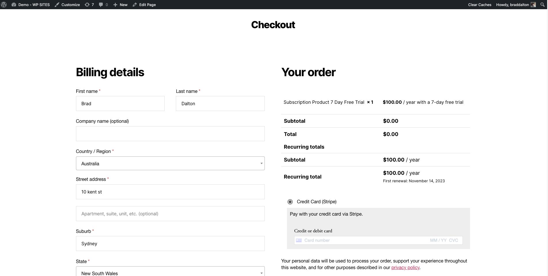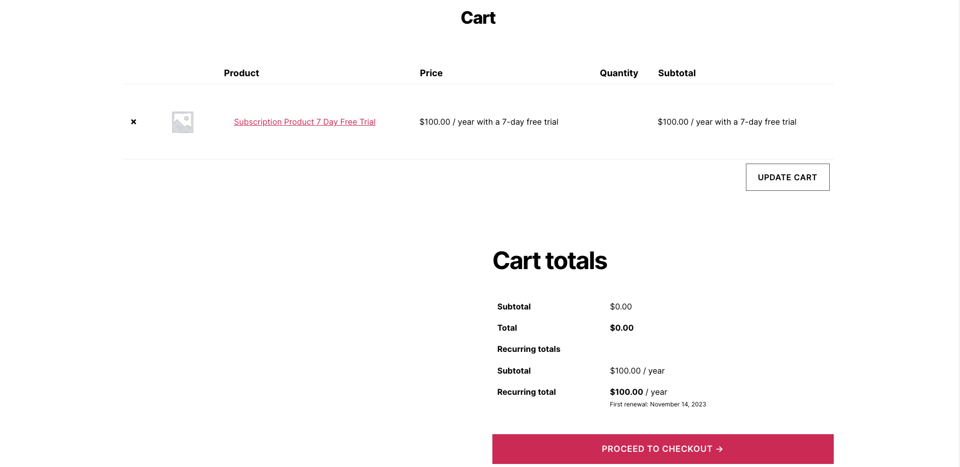 In summary, this code works using a WooCommerce Subscription product with a 7-day free trial where the user sees a price of $0 at checkout and then the annual subscription price at the end of the free trial period.