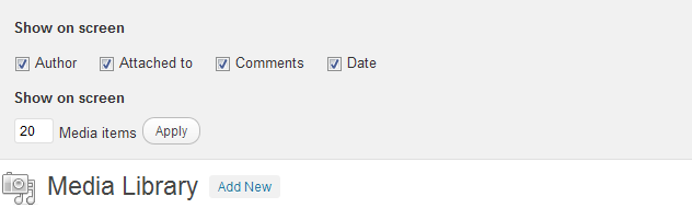 The screen options are different when you are using the Media Library as opposed to the Post screens.