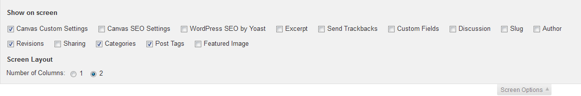 The Screen options tab located in the top right hand corner of your edit post screen displays your screen options. Once the tab is clicked the screen options drop down so you can see all the different modules and columns you can customize on your post edit screen.